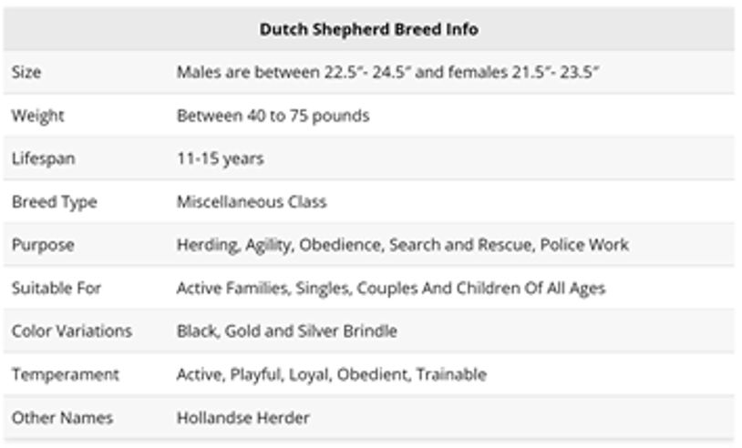 The Dutch Shepherd is a lively, athletic, alert and intelligent breed, and has retained its herding instinct for which it was originally developed. Having an independent nature, it can be slightly obstinate and have a mind of its own. Since its original duties were to keep flocks of sheep in a particular location, it is able to run all day, and that is reflected in its physique and structure. The Dutch Shepherd was discovered as a naturally occurring shepherd's dog living in rural areas. It was developed as an all-purpose farm dog, working originally as a farm guard, drover, and livestock dog. A well known dog fancier wrote about the Dutch Shepherd in 1910: "...bearing a great resemblance to the wolf." Of course this is not entirely true, but it is another aspect that shows that the Dutch Shepherd still has many of the characteristics of its wild forebears. Although it is not a widely known breed, the Dutch Shepherd is a loyal companion and competent working dog used for obedience, dog sports, herding, tracking, search and rescue, and as a police dog. (AKC.org)